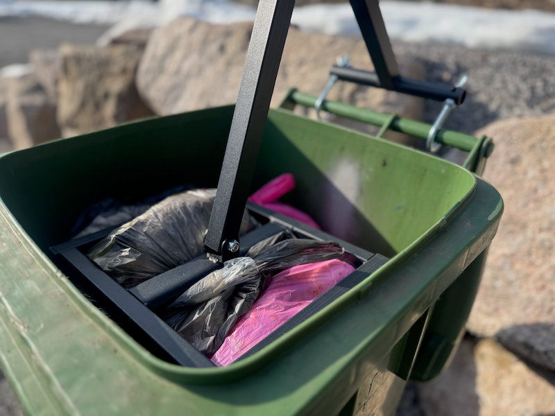 Fest komprimatoren til søppeldunken, press deretter håndtaket ned og du har komprimert din egen søppel.
